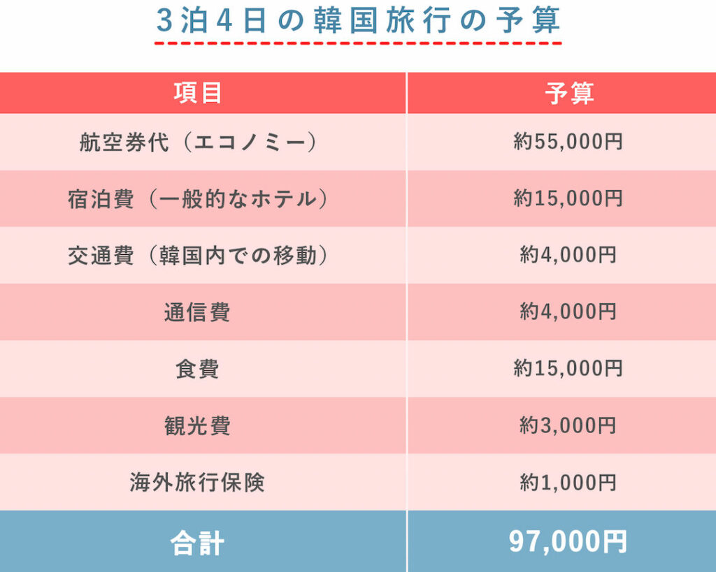 韓国旅行には多くの費用がかかります。特に交通費、宿泊費、食費の3つが重要な要素です。それぞれの費用を具体的に見ていきましょう。