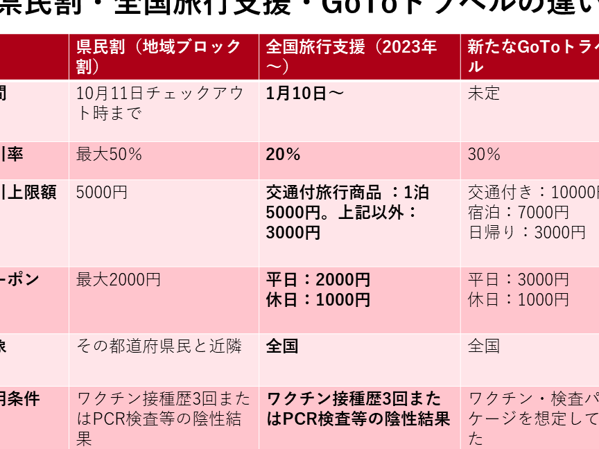 以下は、新しい全国旅行割と過去のキャンペーンとの主な違いです: