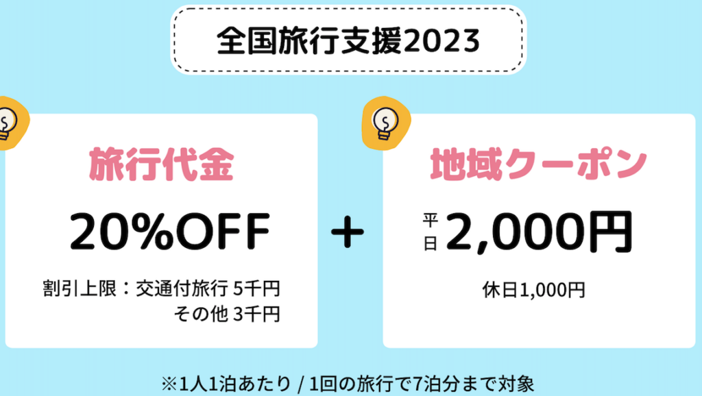 - 宿泊割引: 旅行者は指定された宿泊施設で宿泊する際に料金が割引される制度です。